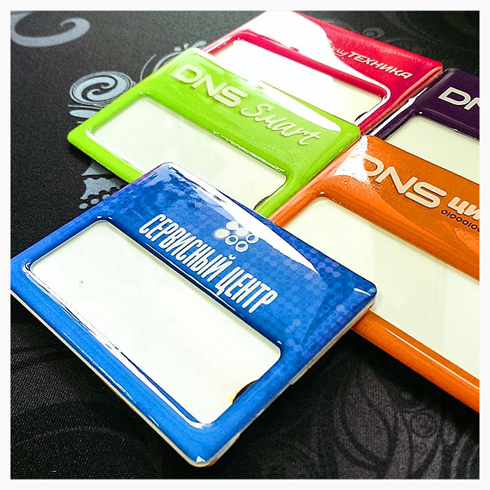 Бейдж пластиковый с линзой и окошком для сменной информации. С магнитным держателем или на скрепке. Тиражи от 100шт. Размер любой