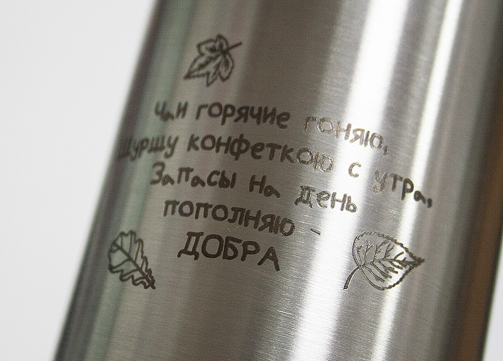 Используется для создания изображений на термосах, фляжках, ножах, вилках, ложках, металлических кружках